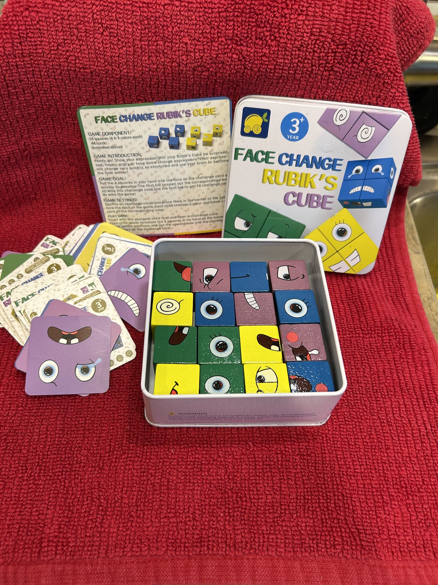 Face Change Rubik's Cube" expression puzzle set, designed for children aged 3 and up. Components: Includes 16 wooden printing blocks and 64 challenging expression cards. Gameplay: Players match the blocks to the expression shown on the challenge cards. Educational Benefits: Improves hand-eye coordination, logical thinking, fine motor skills, and spatial imagination. Storage: The set comes in a durable iron box for easy organization and portability. *** For local sales I meet my buyers in West Mesa at Circle K -located at 1154 W. Rio Salado Pkwy and N. Almaschool Rd. Mesa, AZ 85201