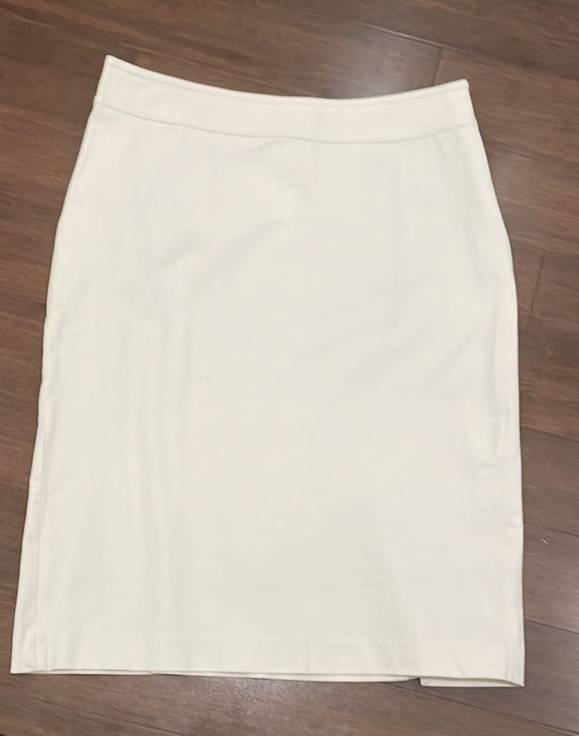 This elegant cream pencil skirt from GAP is designed with a knee-length cut, perfect for professional settings. Its sleek silhouette and subtle slit provide both style and ease of movement, making it a versatile piece for your work wardrobe. Size: 6 Measurements: 30 inch waist, 23.5 inch length Condition: no rips or stains Comes from a pet and smoke free environment