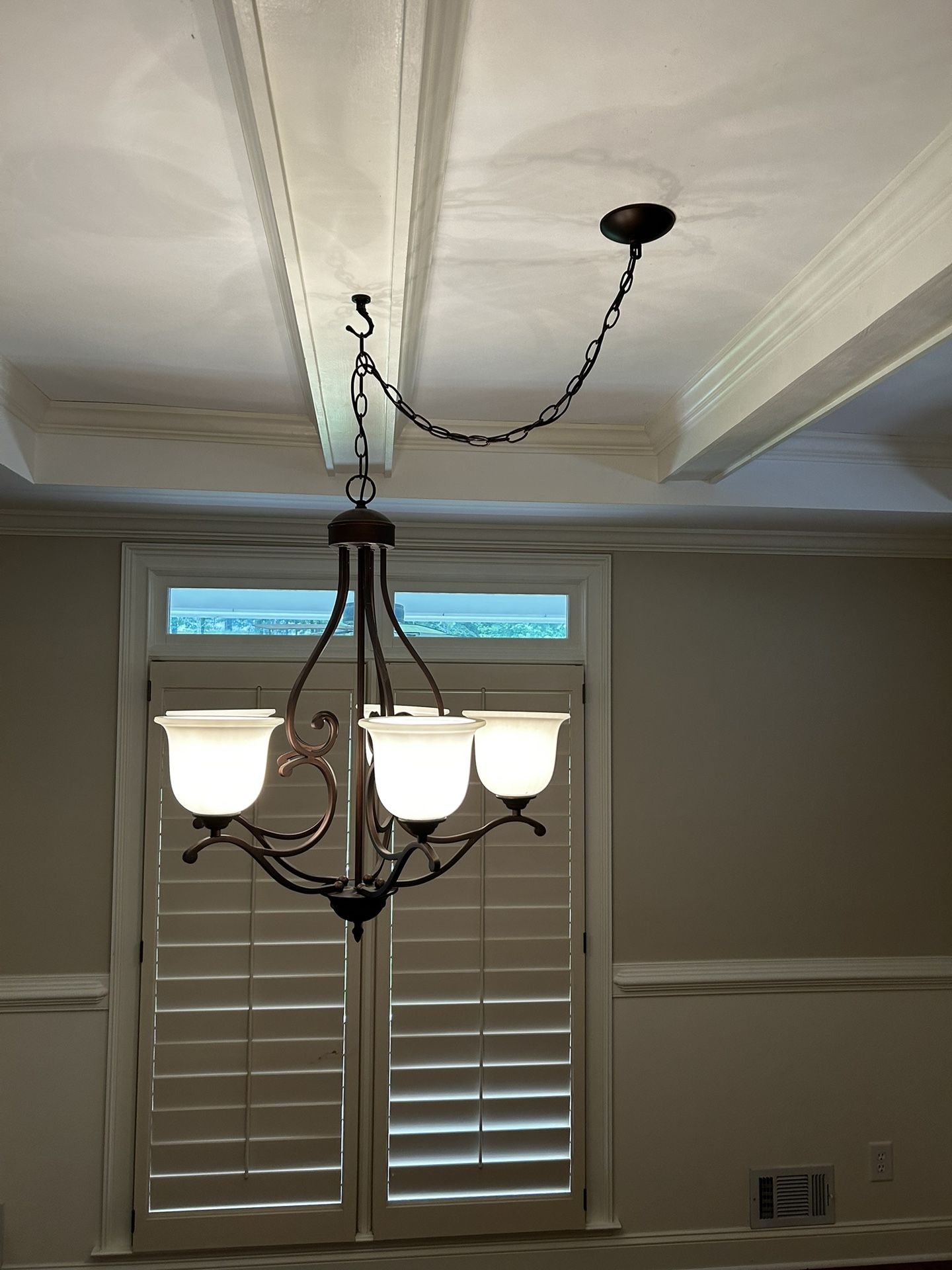 Bronze five light chandelier. Perfect for dining area or small foyer area. One light has a small crack that’s hard to see. It is also dimmable. My husband is a licensed electrician and can install for an additional small fee if needed. Details: Chandelier is about 30 inches tall and 27 inches wide. Chain is about 30 inches long.