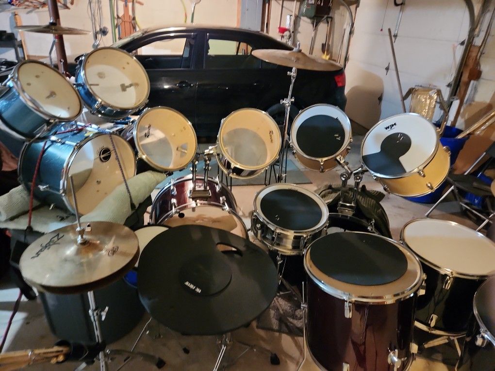 Two drum sets selling them separately 300 $ for the CB drum set Comes with hihat stand and symbols.Snare drum with stand..Practice rubber pad set .. Base drum needs 1 leg. .obo. Symbols sold 500$ for the Reverse drum set.. With hihat and hihat symbols .Snare with stand .. Negotiatable