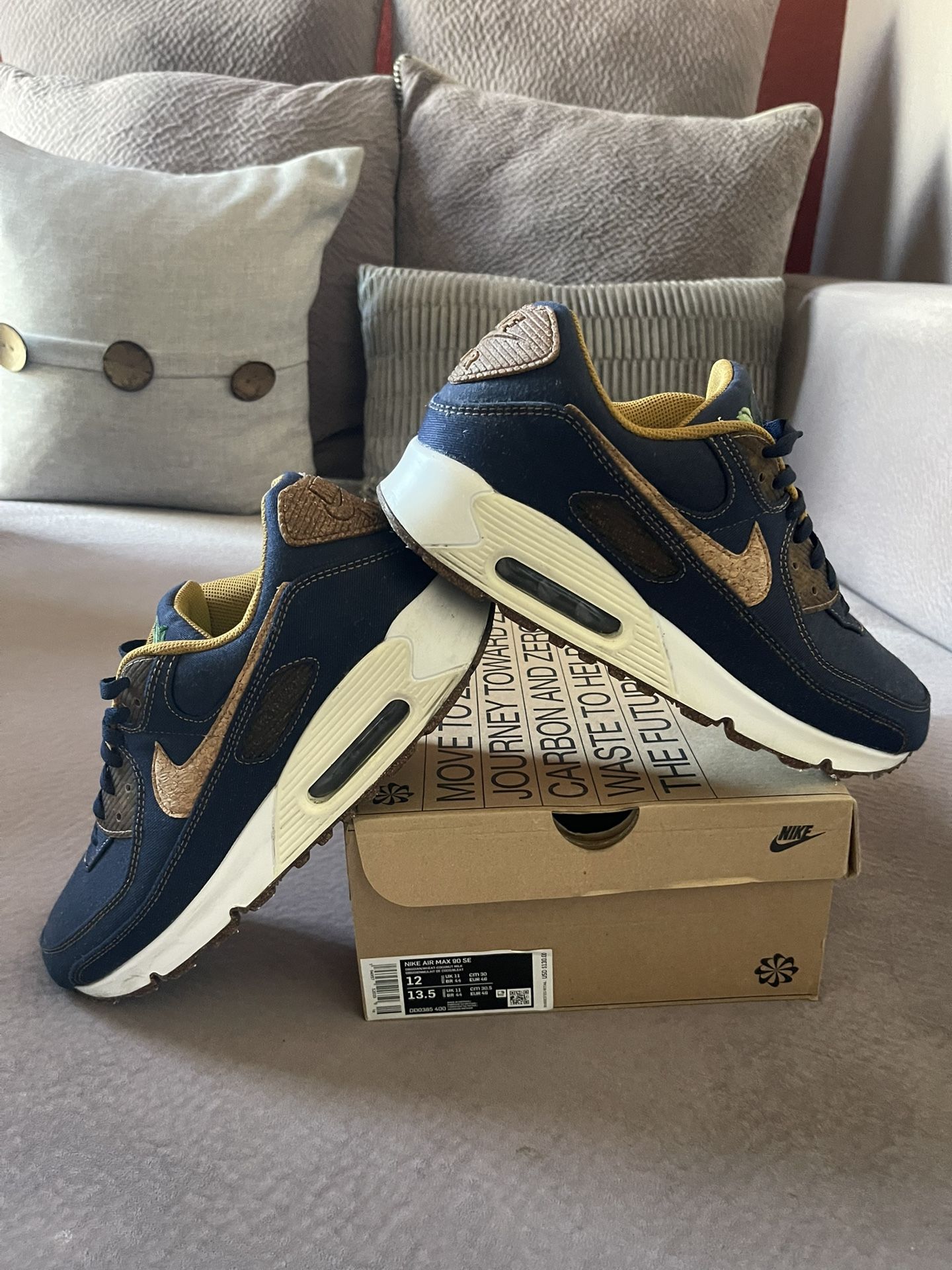 The Nike Air Max 90 Obsidian Cork is a limited-edition release of the Nike Air Max 90 series. The Obsidian Cork Nike Air Max 90 features an upper made of obsidian-colored suede and a traditional lace-up closure. The midsole is designed with Nike's Air technology to provide shock absorption, and the outsole is made from rubber for traction on a range of surfaces. The sneakers come with black flat laces, and the Nike logo is displayed on both sides of the shoe, and the heel and tongue feature additional branding. The Nike Air Max 90 Obsidian Cork was released on June 15th, 2021, at a retail price of $130.