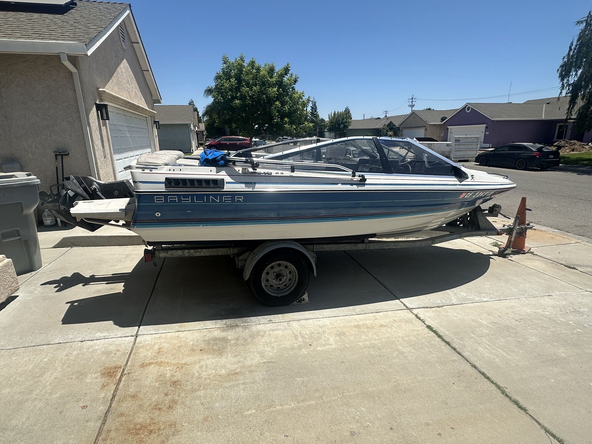 1988 Bayliner Boat out drive 2.3 OMC Cobra 4 cylinder ford engine 19’ Boat cover, boat canopy, Boat and trailer are update on the Registration 2025 fairly new spark plugs and wires replaced new solenoids new tilt control motor new throttle cable new coil new seals on housing where the prop is medium wear inside Boat. Boat runs good