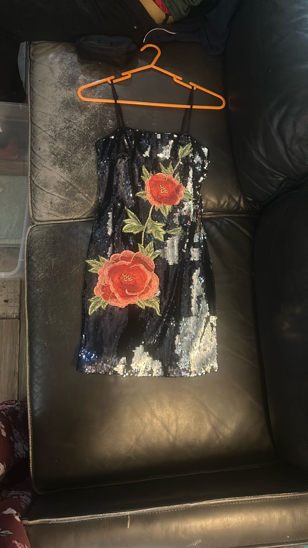This dress is unique, beautiful, elegant and sexy. Only worn one time but it's very comfortable and is comfy throughout the evening. in pristine condition and is a great dress for a party or night out!