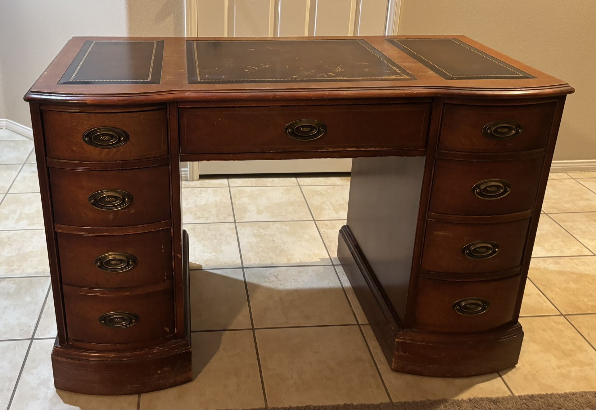Moving-must sell before 12/23! This is a great price! This is a hundred year old executive desk originally owned by my grandfather. Looks beautiful from both the front and the back view of the desk so it’s perfect wherever you place it in a room. Has 8 deep drawers. One drawer can be used for storing legal size files (disguised as two drawers). Includes original hardware handles and wood molding at the base. Some minor scratches but otherwise in good condition. It’s a medium sized executive desk which makes it a good fit for most rooms or studies (45”D x 23”W x 30”H). Pickup only. Asking $65 OBO