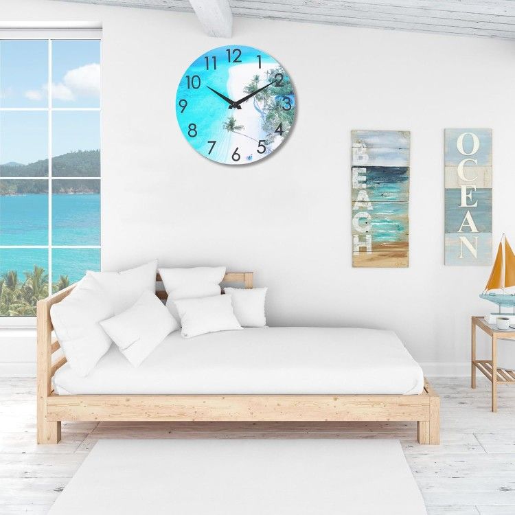 Stylish and durable outdoor clock with a coastal blue design. Waterproof, glass-covered face ideal for patios, pool areas, bathrooms, or garden decor.