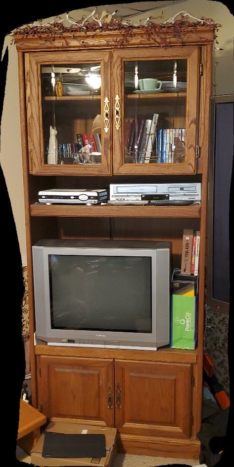 Wood TV/media/entertainment cabinet shelf with glass doors. Approx 6'4"H x 33"W x 18"D. Top section has glass paned doors with 1 shelf so 2 usable shelf spaces. Shelf above largest opening/TV area pulls out. Bottom section has wood doors = closed storage. Great condition, very sturdy. Excellent storage piece with not a huge footprint. CABINET ONLY! Other items shown NOT INCLUDED. BUYER MUST PICK UP & TRANSPORT - bring help & a large enough vehicle! Serious inquiries only. Non-smoking home. Cross posted.