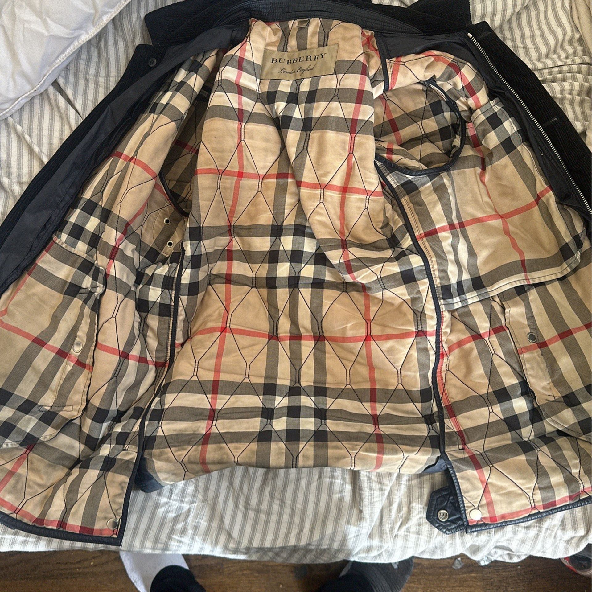 Used Really take care of, Nice Dark blue Burberry jacket. Selling because I bought a new one. I won’t use it no more. Just sitting in my closet.