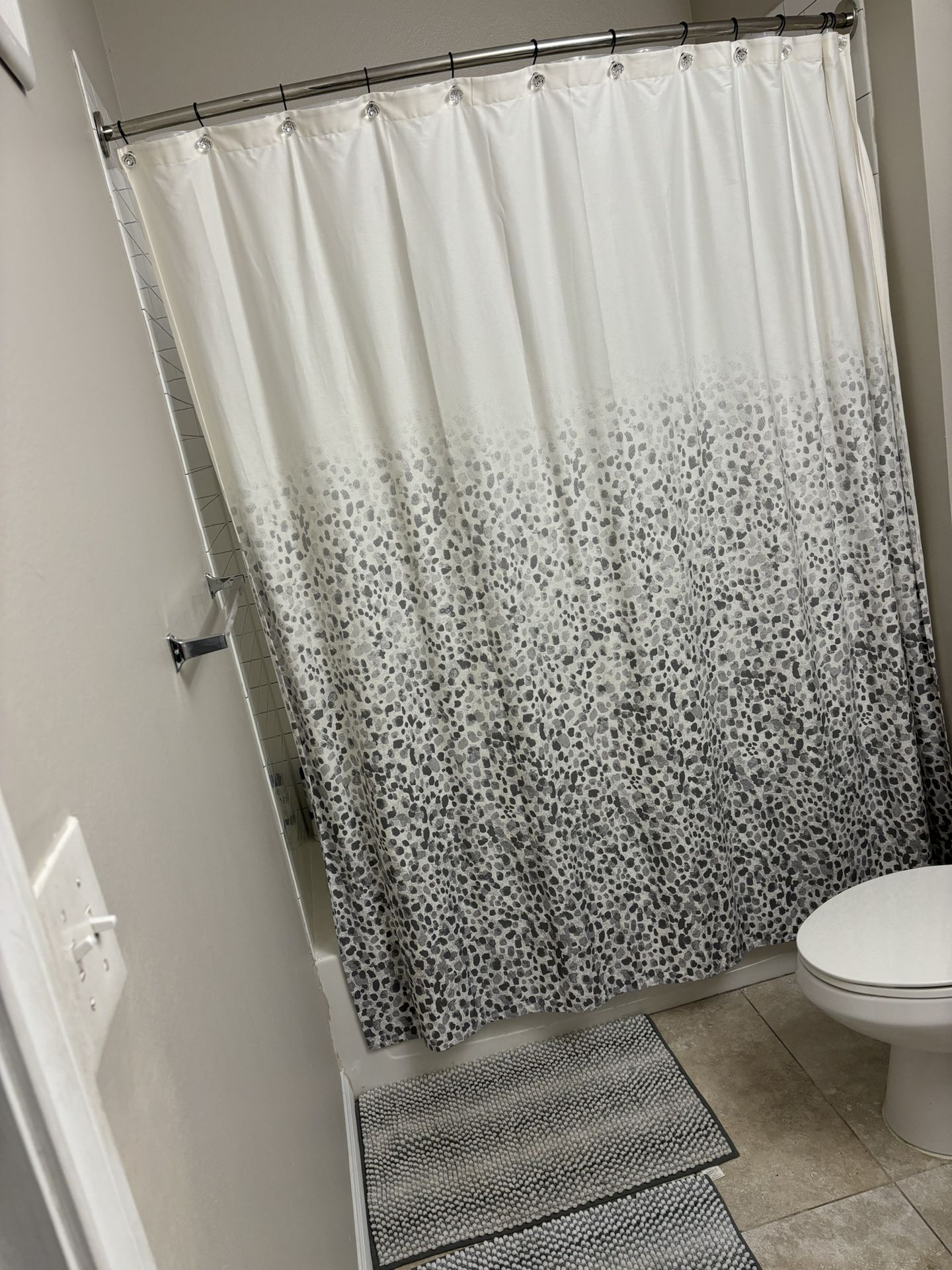 Beautiful Shower Curtain Set Includes 2 matching bath mats And shower curtain hooks Complete set. Nothing is missing.