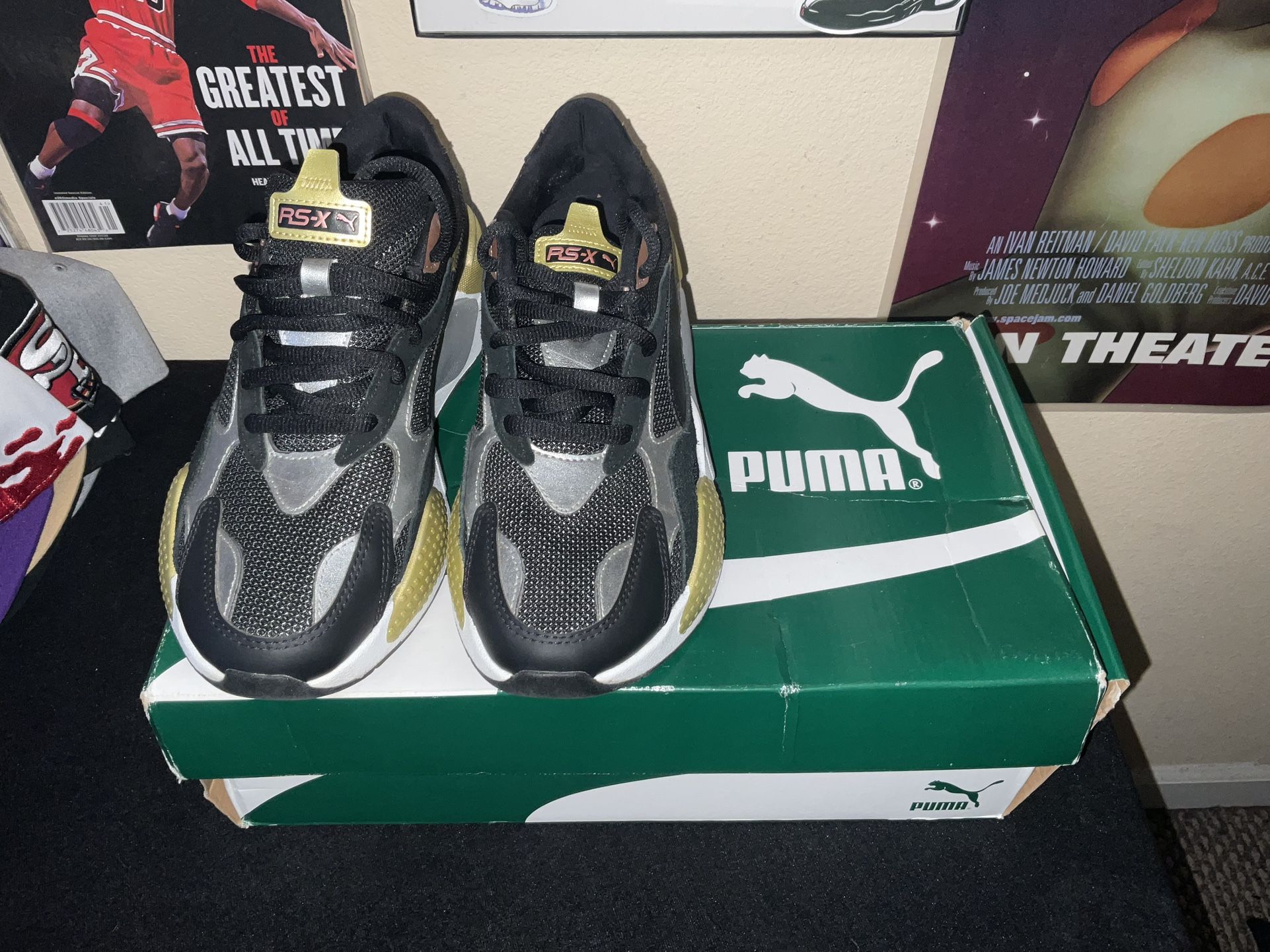 PUMA RsX Metallic Gold Rose Gold Lace Up Womens Black Sneakers Nipsey Shoes size 10 WMN 8.5 Men OG Box Excellent only worn twice