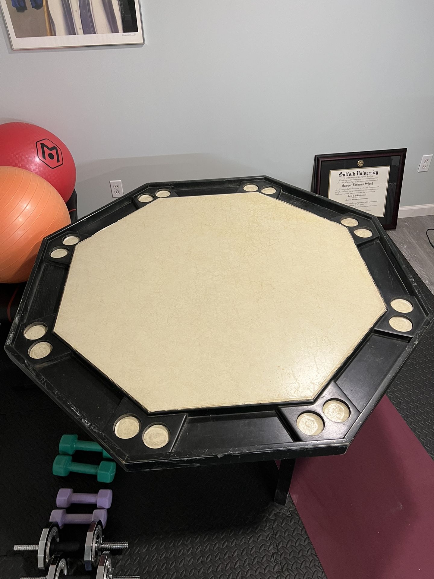 8 person poker table with cup holders and conversion cover to make it flat. Belonged to grandfather, likely from 1(contact info removed). Conversion top says Kestell Furniture