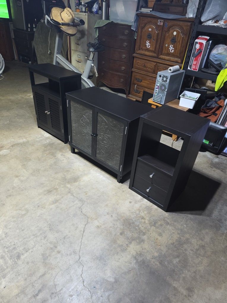 Brand New Cabinets Set for any use bathroom living room tv stand kitchen etc. Middle one has glass front with carved designs on the inside. Left one measures Height 31 3/4in Lenght 23 3/4in Width 1ft. Middle one Height 27 3/4in Lenght 31 1/2in Width 15 3/4in. Right one Height 30in Length 16in Depth 15 1/4in.