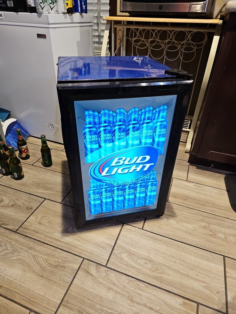 Just in time for your man caves out door patios garages or little store . Bud light display cooler. Keep your next one nice and cool or impress your friends at your next party. Or just for your practical needs and free up space in your fridge. Front door has working lights and inside working fridge light and 3 removable and adjustable shelves, youcan stand your drinks up or lay them down. Has some peeling from having microwave up on top... can tape down or you can buy blue vinyl tape and redo it.Have plugged in to verify cooling. 160 or best offer. Don't be afraid to make offer.