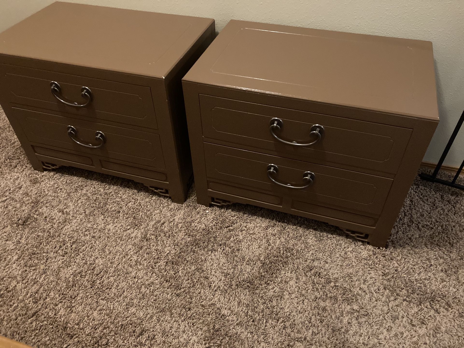 2 solid wood nightstands made by White Furniture Co. In good condition. 28” wide, 22” tall, 18” deep. Missing one decorative bracket on back leg as shown in photo. Drawers work great. Non smoking, non pet home. You haul.