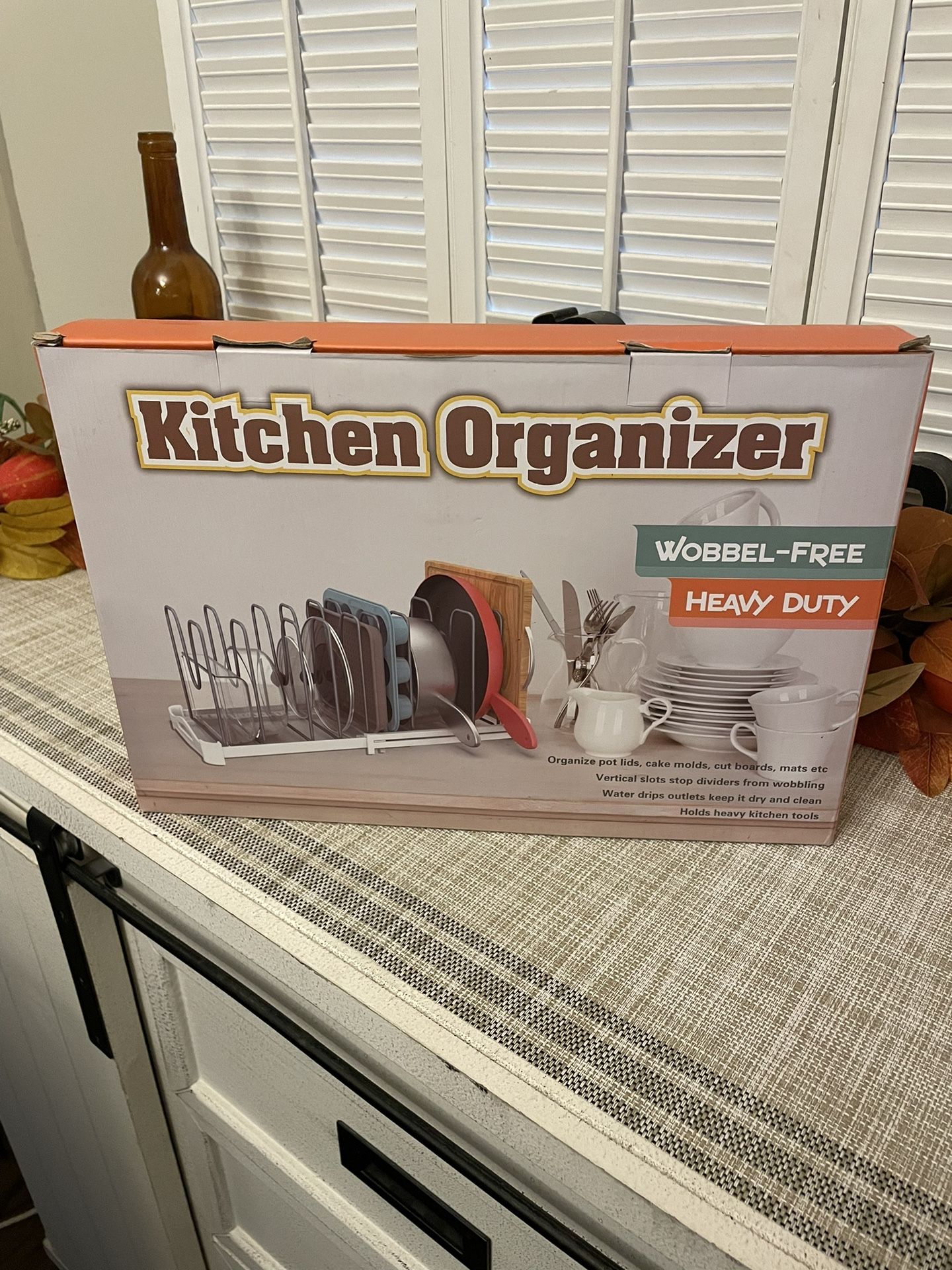 Adjustable bakeware organizer pot lid holder, rack for pots, cake molds, cutting boards, mats, cookware. 12.6” deep to 21.5 wide. Brand new, never used & box only opened for pictures. Will accept best reasonable offer. Cash Only!