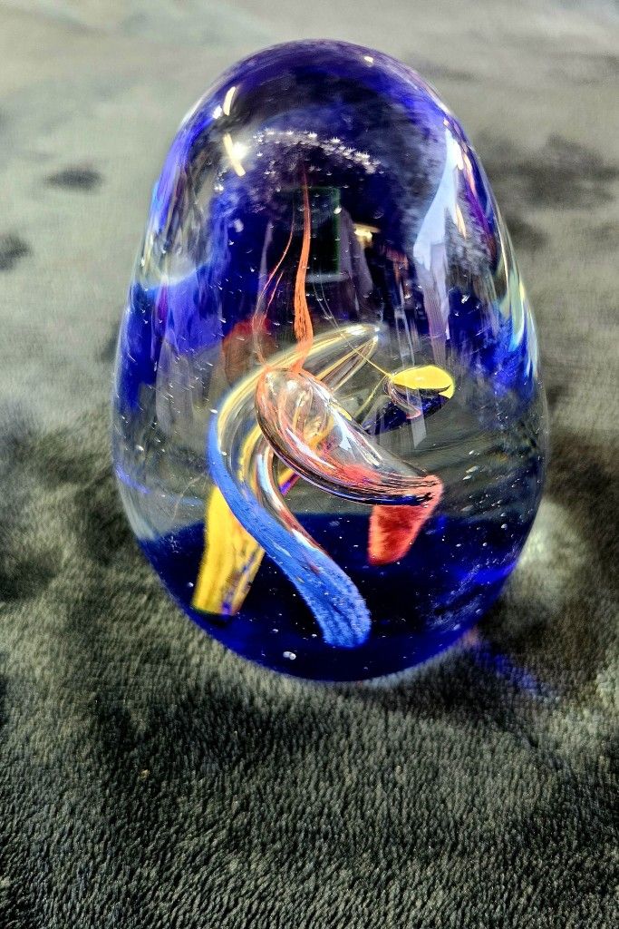 Vintage Art Glass Egg Shaped Swirl Controlled Bubble Paperweight blue