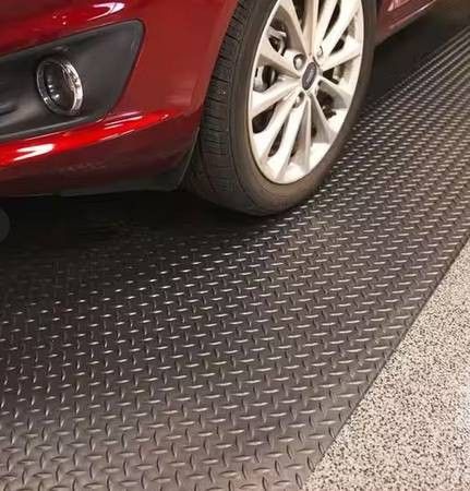 7.5 ft. W x 14 ft. L Midnight Black Diamond Plate Commercial Vinyl PVC Garage Flooring Raised diamond surface pattern provides a rugged appearance and great slip resistance Residential and commercial PVC garage floor mat Ideal for garage over concrete and wood subfloors Resistant to contaminants found in garage and work environments