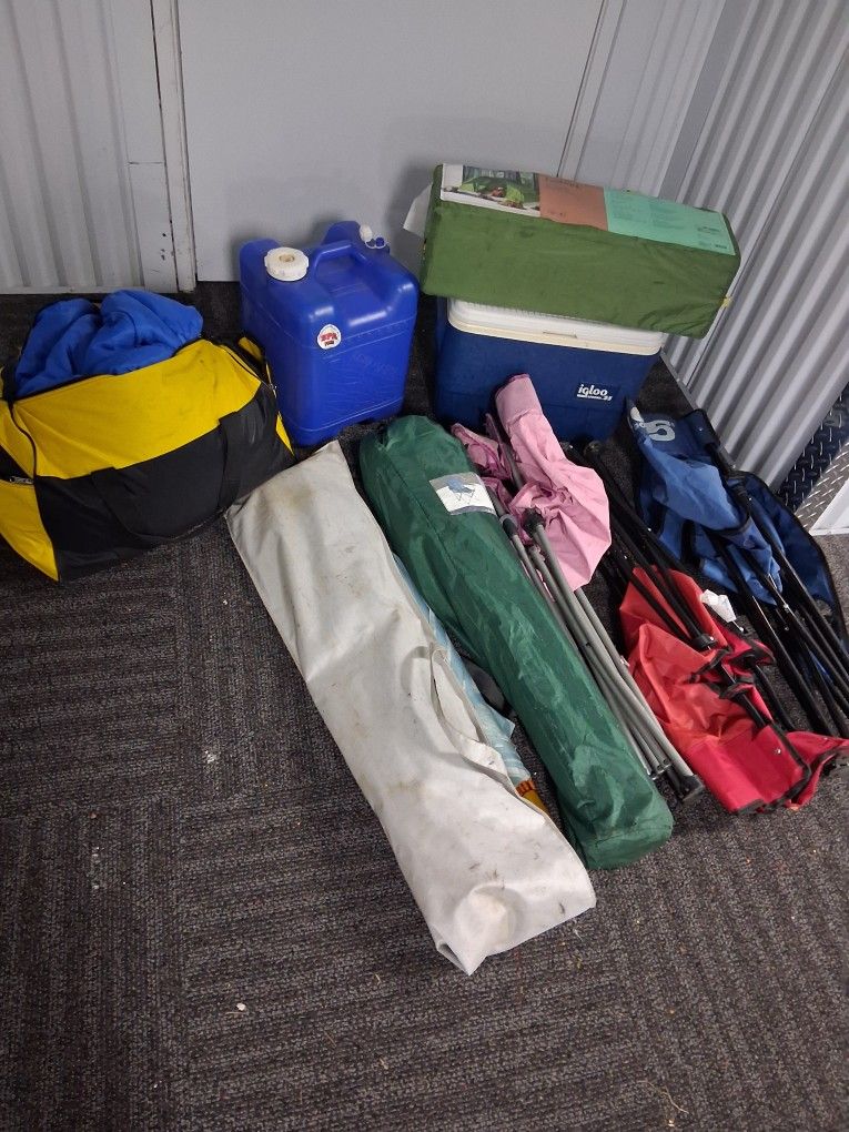 6 person dome tent new .4 folding chairs .ice cooler. 1 sleeping bag .5 gallon water can 1 lanter