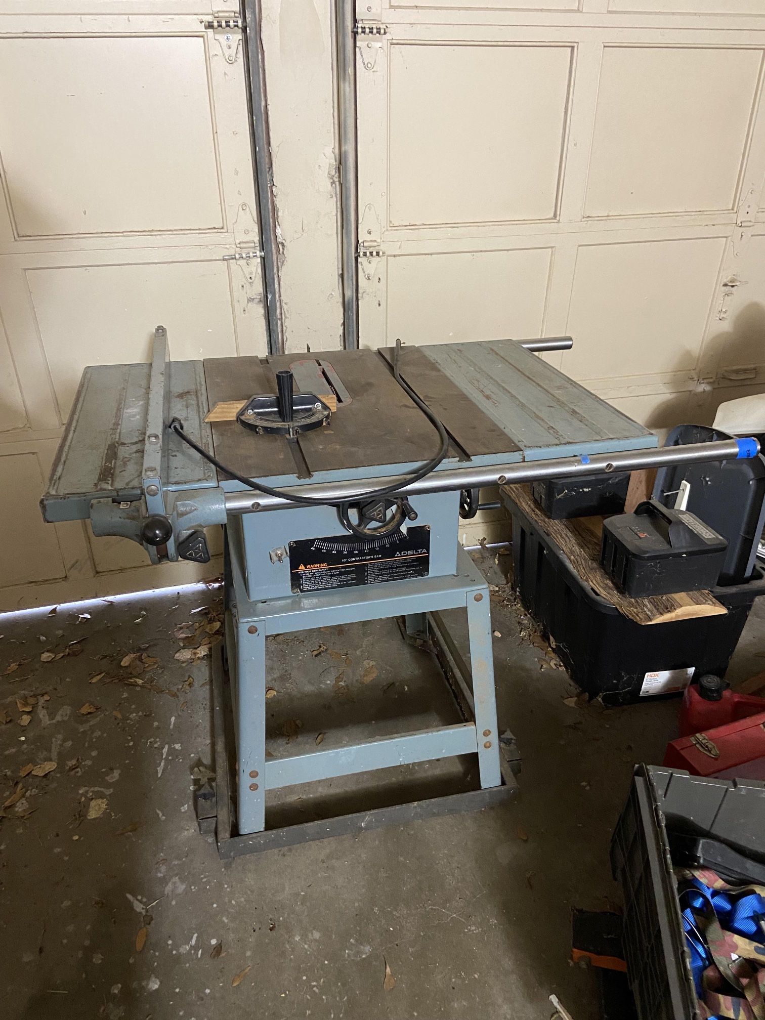 Delta 10” contractor saw with cast iron top and steel extensions. These older Delta units are known for being tough, simple, and reliable. Motor runs strong and it cuts well. Features: • Solid cast iron main table • Steel extension wings • Belt-drive motor • Adjustable blade height & bevel • Mounted on a sturdy stand • Great restoration or starter project It’s not a showroom piece, but it’s a classic Delta workhorse and still has plenty of life in it. I upgraded to a bigger saw so this one can go. Pickup in Shoreline — bring help; it’s heavy.