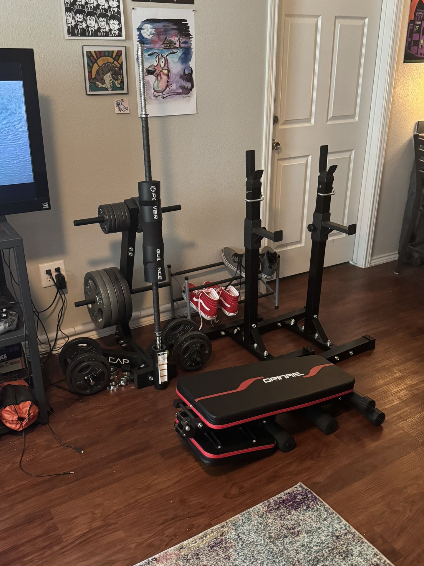Comes with bench, weights (185ib), holder, squat rack, quick release weight stopper, and pretty much everything that you see in the photo that’s workout equipment . All in good condition. Have any questions let me know.