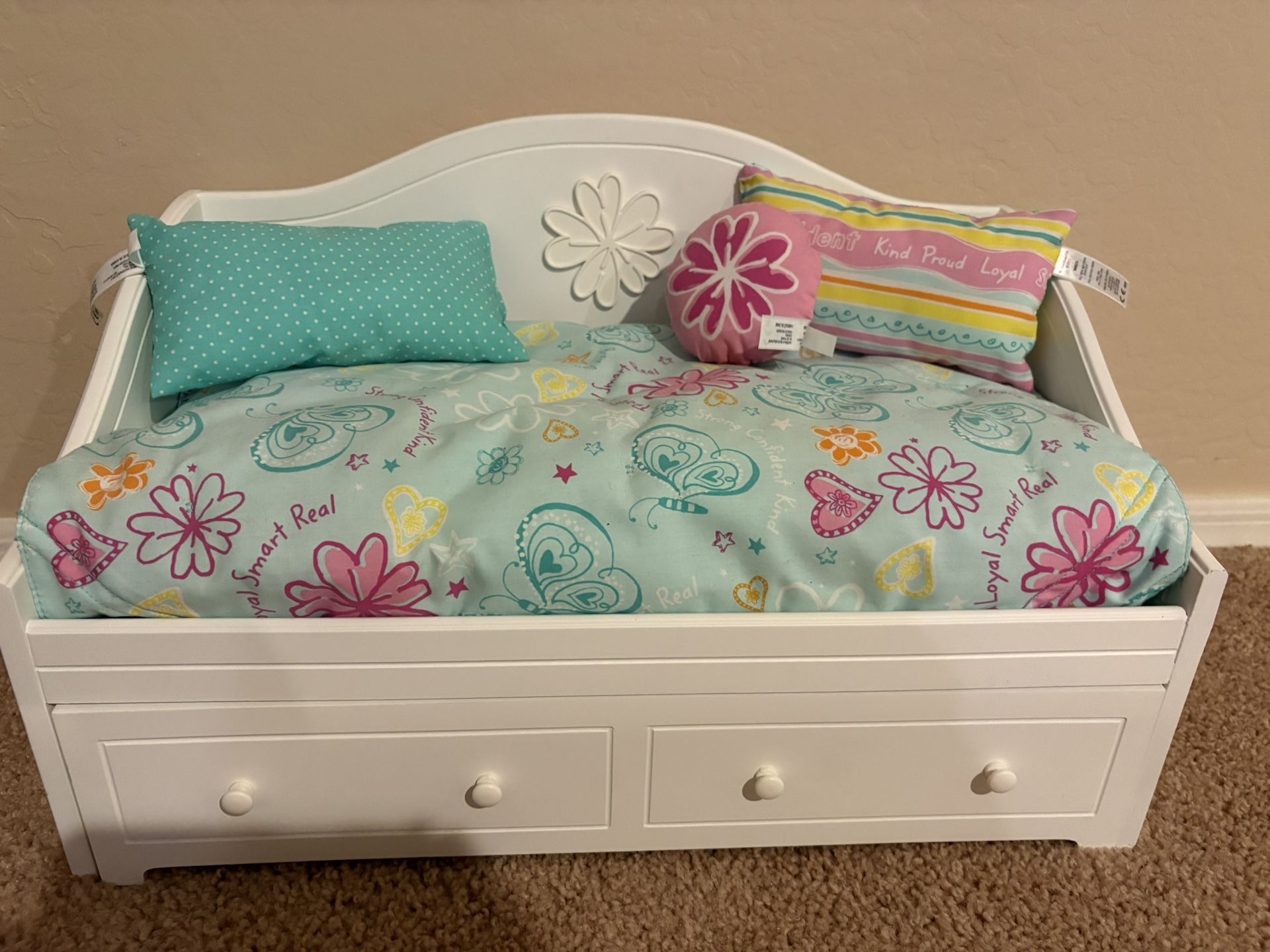 American girl, doll bed, bedding, and trundle. Used, like new. Porch pick up.