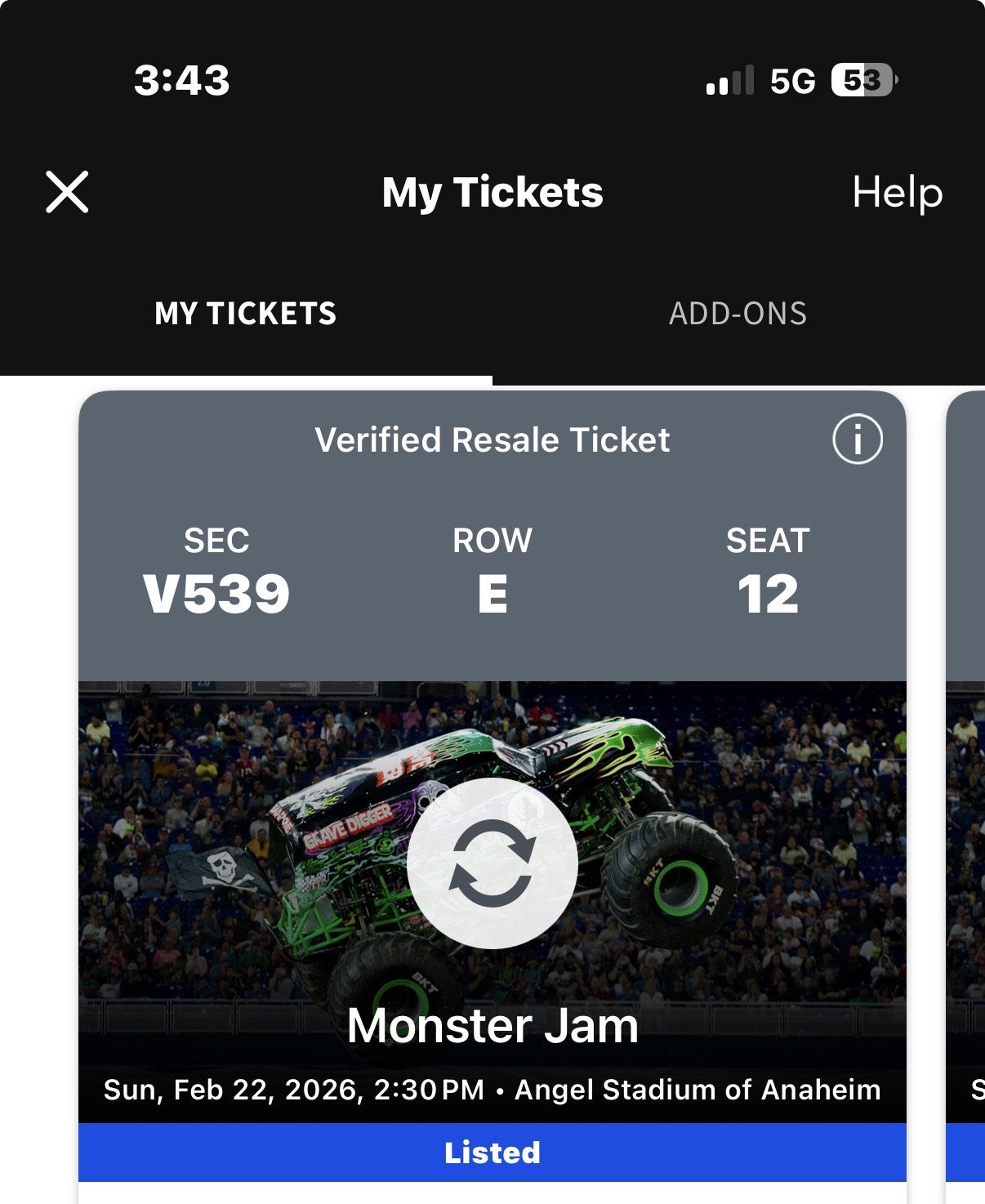 4 tickets to monster jam on Sunday Feb 22nd. Seats 12-15. 200 obo, less than I paid for them without the fees. Transfers through Ticketmaster.