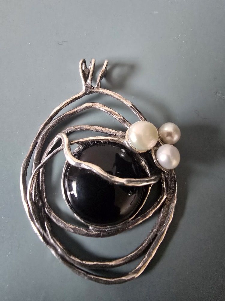 This elegant, modern pendant features a striking onyx centerpiece surrounded by a unique silver design accented with delicate, freshwater pearls. Perfect for adding a touch of sophistication to any outfit. Light reflects from the front it, and it's in excellent condition. The back is in good condition with minute imperfections. Noa Zuman. Made in Israel. Stamped. 925 Sterling Silver. Pendant Only.