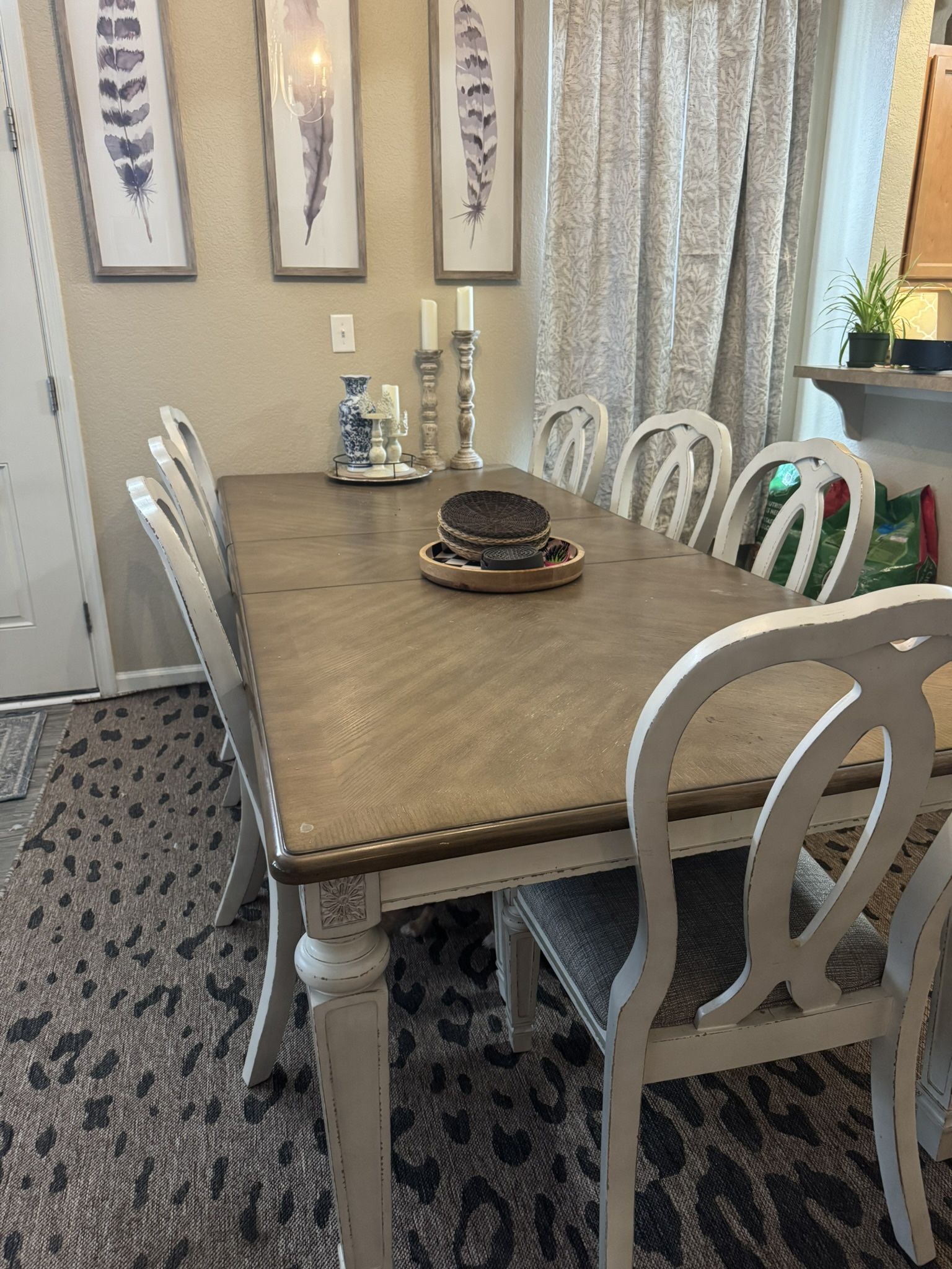 Only have had for about a year. Selling only because I have car repair expenses. The top has some marks from my kids doing their homework and just normal everyday use. One chair does have some chew marks on the very bottom of the legs from a puppy. (8 chairs are included but only 7 shown) The server has a scratch on one of the doors but isn’t noticeable and does not cause any issues. No holds Price is firm Smoke free pet friendly y