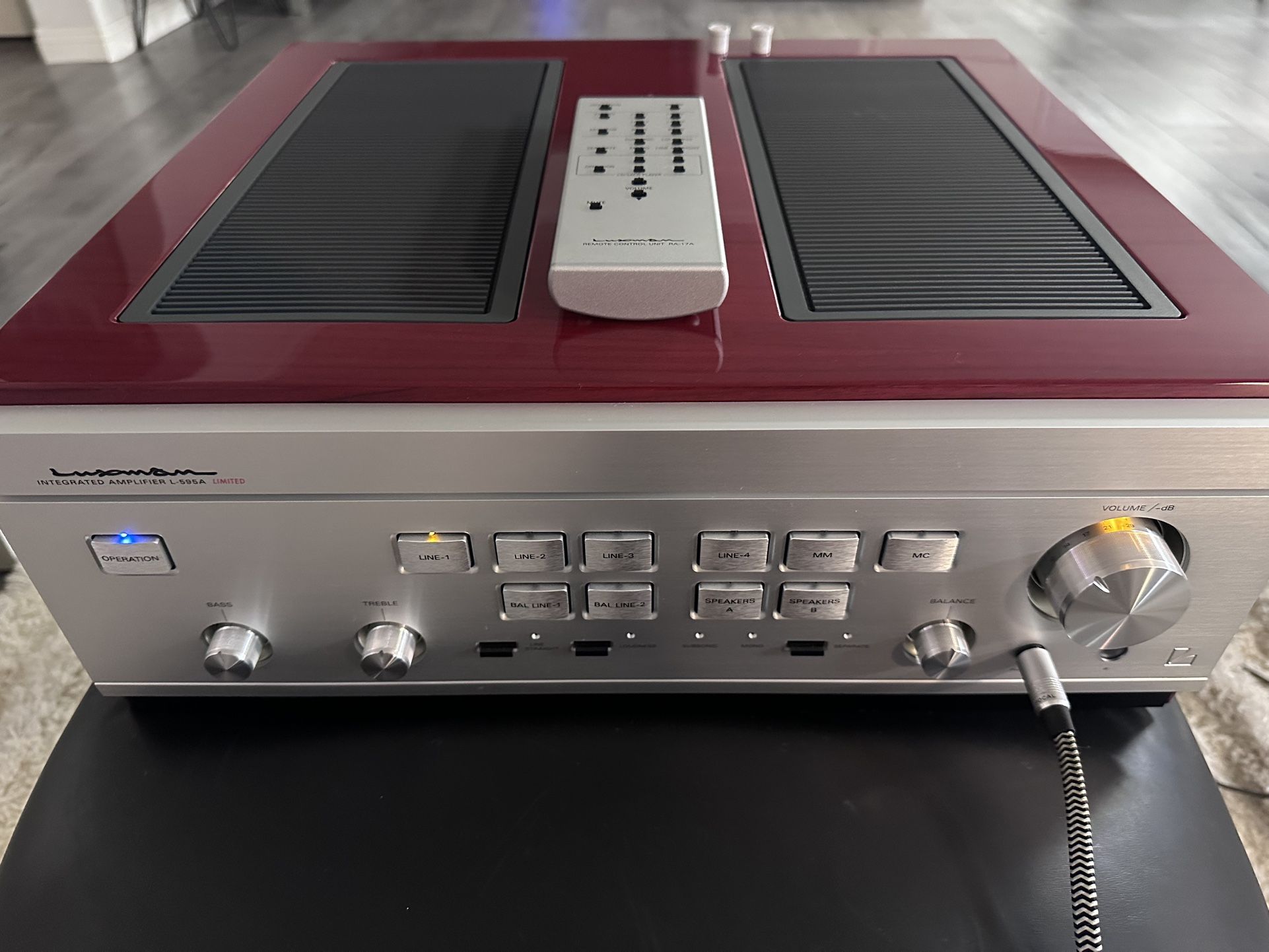 Award winning LUXMAN 95-year limited edition class-A L595A integrated amplifier 30w class-A x2 at 8 ohm 60w class-A x2 at 4 ohm Japan version 100v, a 120v-100v step-down power transformer recommended (600w or higher) Comes with original remote control, power cord, user manual and box Excellent cosmetic and functionality condition, beautiful glossy red wood case finish The Absolute Sound editors choice award in 2021 Key features Class-A amplifier with ODNF-u (only distortion negative feedback Ultimate) LECUA1000 88-step attenuator Copper alloy RCA terminal (line in 1) total 4 RCA inputs Copper-clad. Steel shielded internal cabling Build-in phono MM/MC inputs Preamp out / main amp selection for bi-amp and separate functions Loudness compensation Speaker A + B outputs 2 balanced XLR line inputs Original RA-17A remote control can operate LUXMAN digital players Damping factor 370 S/N ratio 105 dB or more THD 0.007% Dimensions 440 (W) x 193 (H) x 462 (D) mm 29 kgs
