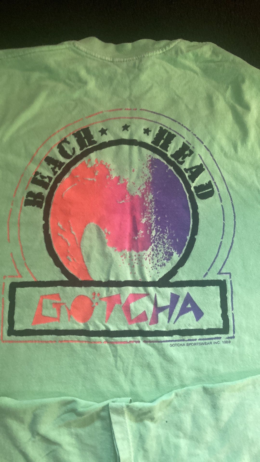 Vintage 1989 Green Gotcha tee with a vibrant graphic design. Perfect for casual wear. Rare - 100% Cotton.