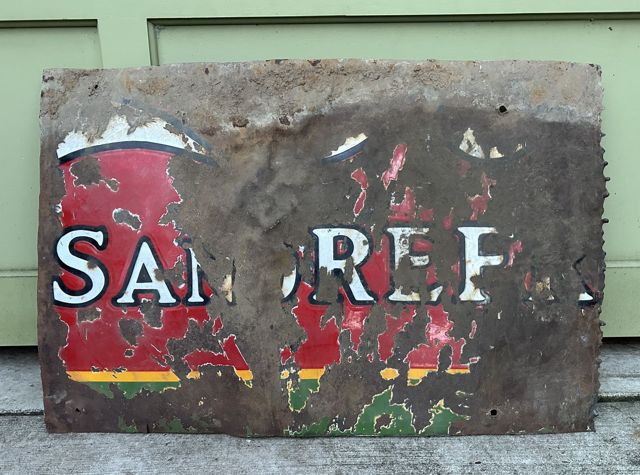 Section of an old vintage metal sign with plenty of patina, rust. Cabin, farmhouse, or industrial style wall decor item. 31 x 21”