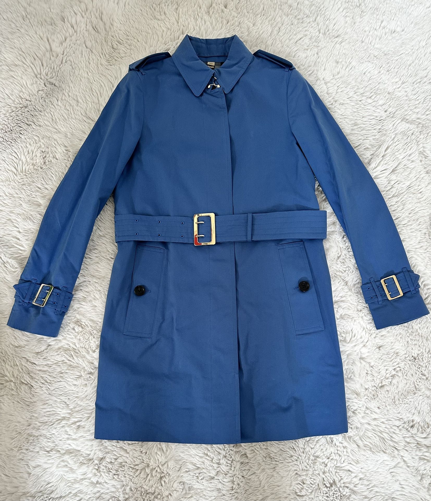 Never been worn. Bright Steel Blue Trench Coat. UK size 06. US size 04. EU 38. Silver buckle details around waist and wrists. Black buttons. Extra buttons in pocket