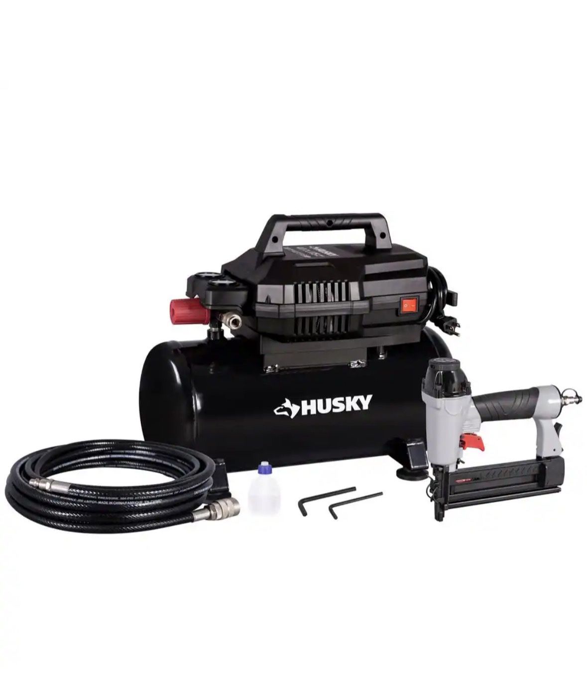 BRAND NEW IN BOX Husky 4 Gal. 175 PSI Electric Oil-Free High Performance Air Compressor with 25 ft. PVC Air Hose and 2-in-1 Brad Nailer/Stapler