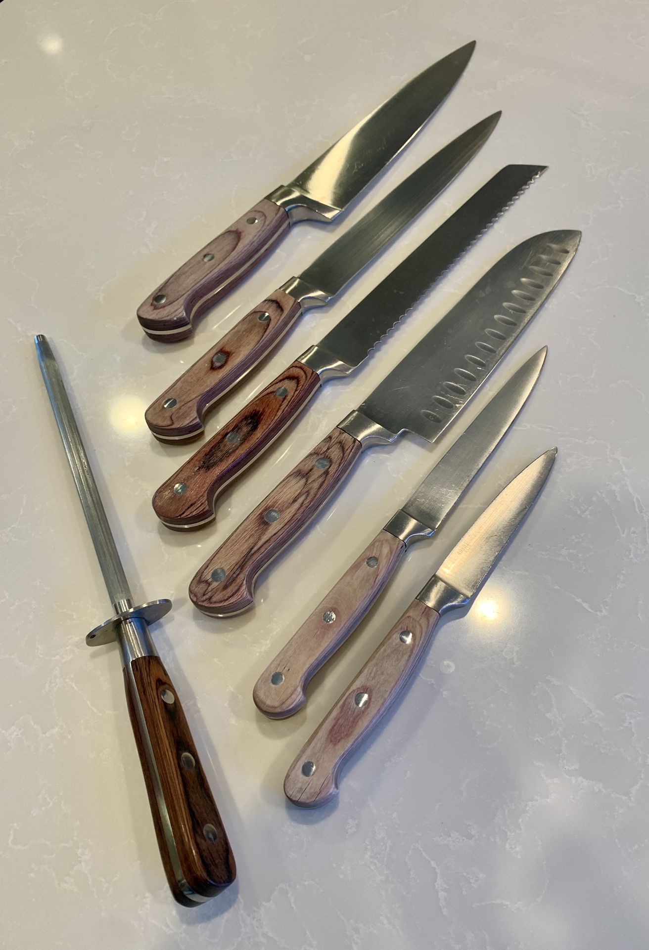 Includes bread knife, steak knife, knife sharpener, peeler, knife, and more