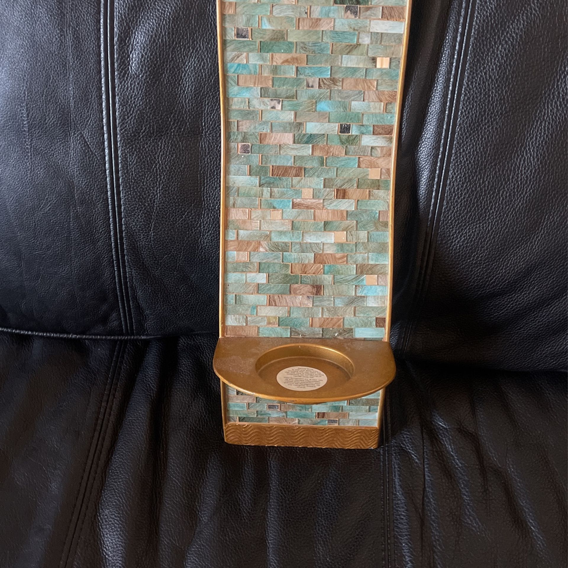 Approximately 20” x 6”. Made of metal. Gold color with teal, tan and mirrored glass mosaic tiles in a subway pattern.