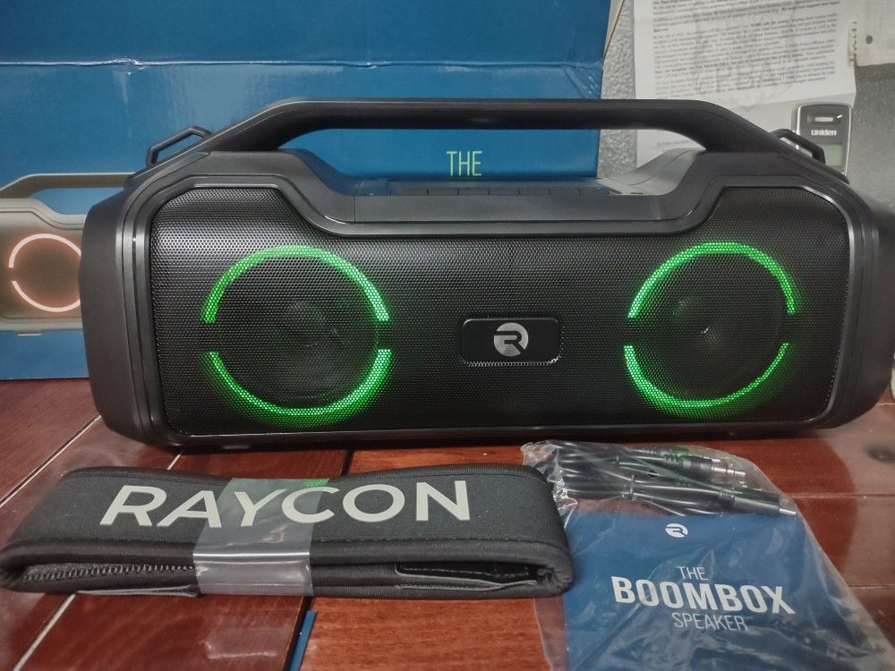 RAYCON THE POWER BOOMBOX SPEAKER Product Description: Model No. RBS951-21E Brand: RAYCON Old School Style with new-school sound, 3 different sound profiles (Pure, Balanced, and Bass) to personalize your musical preference and optimize for any type of content with big booming audio. Get 7 hours of playtime on one full charge. LED Party Lights that sync up with your music. IPX5 Water Resistance. Multi-link Mode that connects two Boombox speakers to get stereo sound. 4 different audio modes: Bluetooth, AUX, USB, FM. Universal Compatibility with all wireless technology smart devices. Easy to Pair. Can Act as a speakerphone. On-the-go strap for easy portability. Product Specifications: Power Output: 57W max, 36W RMS. Dual 3 in. drivers. Frequency Response: 20 Hz to 20 kHz. Wireless Connectivity: 10 meters. Bluetooth version: V5.0 Mode: USB/ AUX-IN/ FM Speaker Power: 20 W. Battery: 6000 mAh 3.7V Playtime: 8 hours. Charging Time: 6-8 hrs. Controls: Button. Material: ABS Charging Cable Type: TYPE-C Additional Information: Speaker Driver Size: 2 * 3 inches. Product Size: 15" * 6" * 8" (Approx.) Master Cartoon Quantity: 4 units Master Carton Dimensions: 17" * 13" * 16" (Approx.) Model No.: RBS951-21E-BLK UPC: 8 11162 03125 8 Package Includes: 1 * Boombox Speaker 1 * USB-C Charging Cable 1 * AUX Cable 1 * Manual Booklet Pick up or Meet up in New Rochelle NY Shipping maybe available. Serious buyers and Inquiries only. Thank you for checking.
