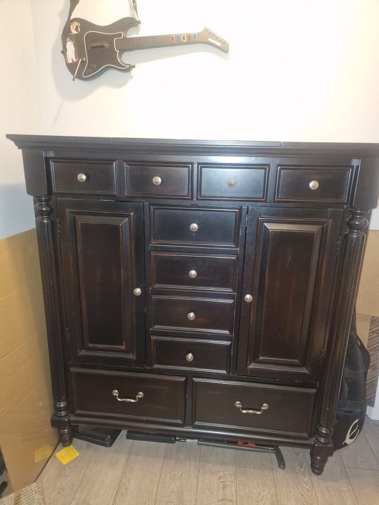 Barely used, stored in the guestroom. Height: 55" Width: 51" Depth: 20" 8 Drawers and 2 Cabinets (Doors) Comes with "secret" compartment with a mirror. See photos for condition. Pick up & cash only. Bought at Living Spaces.