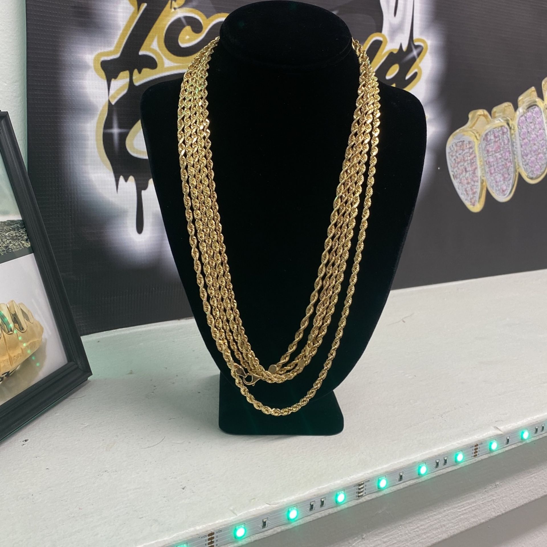 Solid gold chains, suite located in Downtown if you want to come see them yourself 26' 14k solid 48grams $2,600 24' 14k solid 24grams $1,650 24' 14k solid 44grams $2,400 All new what's on the list is what we have stock anything else is ordered and with a week wait time period.