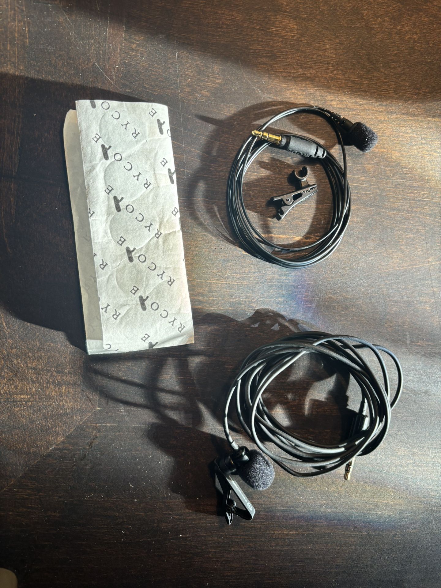 1 Power Dewise Lav Mic and 1 SmartLav+ Rode Wired Lav Mic Both have windscreens and clips. Comes with a few extra Rycote stickys. Connects via 3.5mm for varied compatibility. Used them with 2 to 1 DJI Lav mic kit but no longer have it. Retails at $100 new for both. $35 OBO