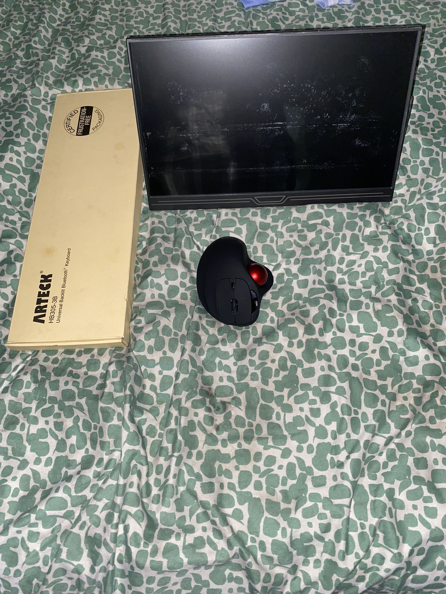 Portable laptop screen with cover and cables also comes with a wireless keyboard and mouse pretty much brand new only been used once to be tested selling because I don’t need it perfect working condition