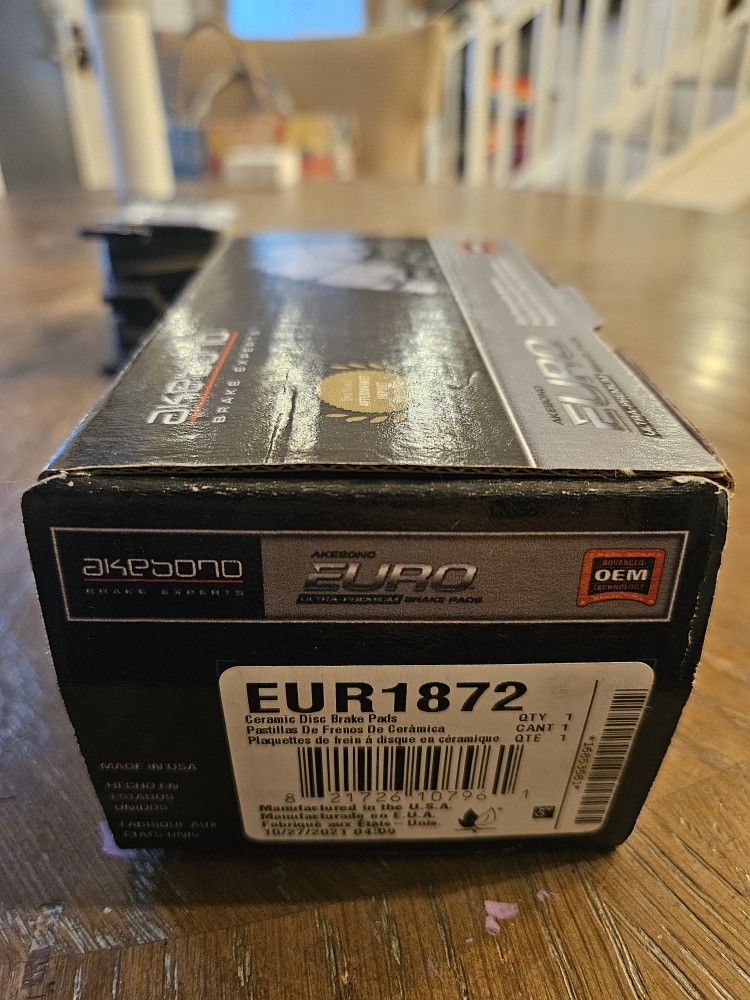 New In box set (4) Brake pads. Akebono EUR1872 with wear sensors and metal pins.