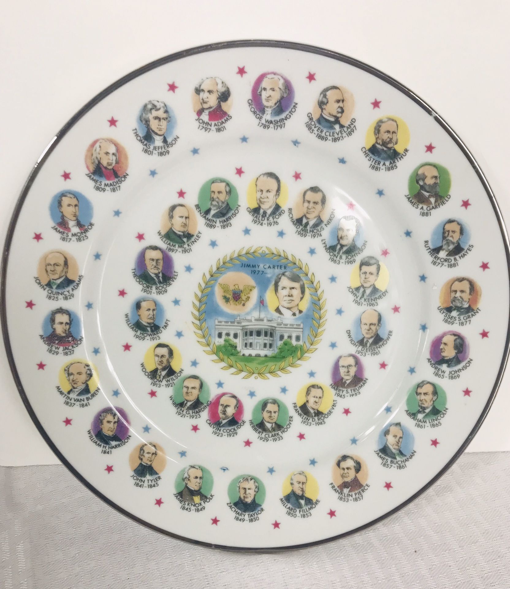 Description: This 10.5” diameter decorative collector’s plate is over 40 years old, but has been well cared for. It displays portraits and names of all the US presidents from George Washington to Jimmy Carter in color, on a ceramic plate with a white background and gold metallic trim on edge. Plate is for decorative use only. No makers marks other than “Japan”. I see some blemishes like paint loss on the plates edge. Other than that it looks to be in good condition. Add this to you collection.