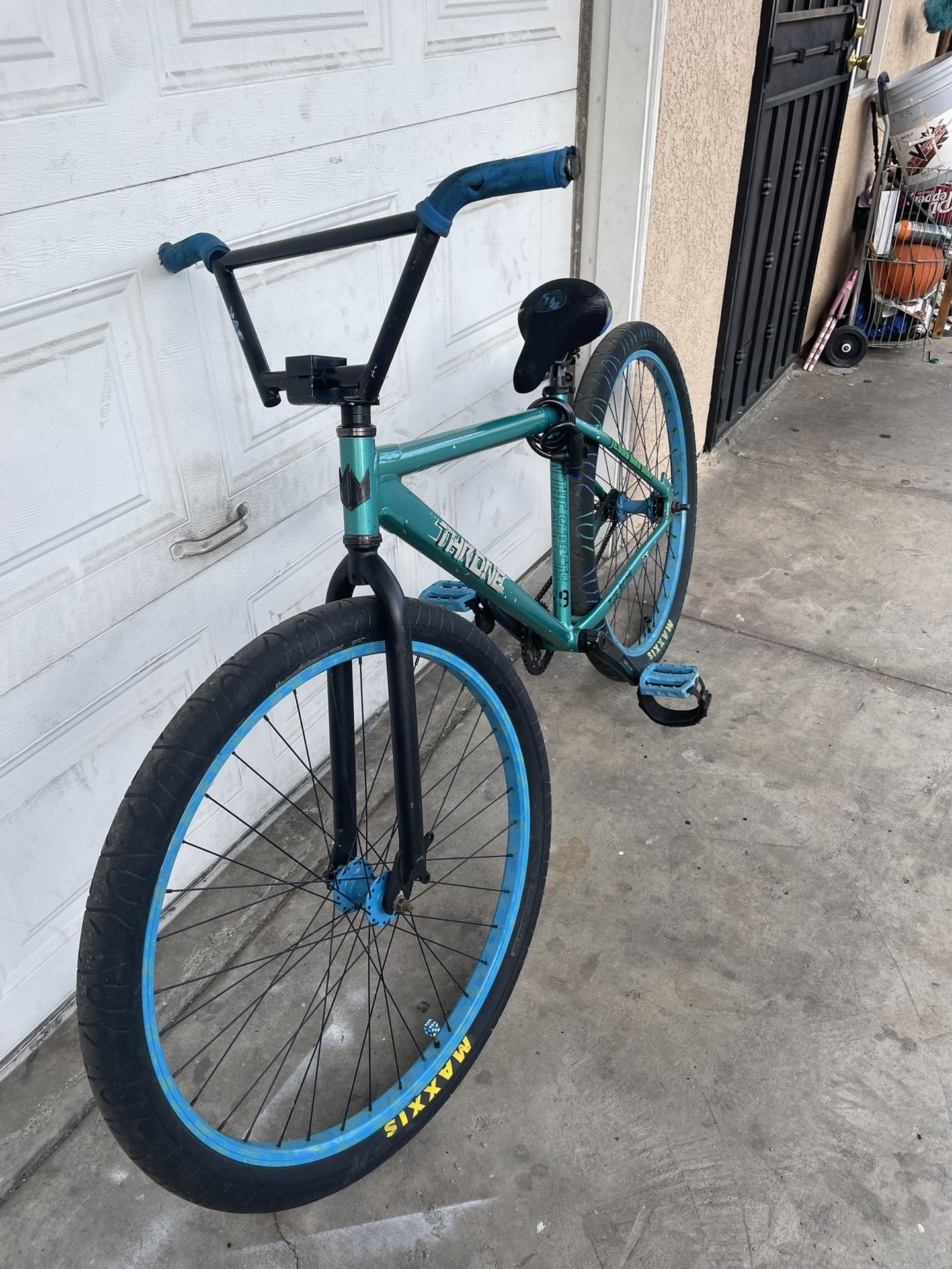 maxed out bike partlist: ros seat deor cranks superslant se stem oaklands demo blue grips demo pedals well go straps maxi tires palm rims