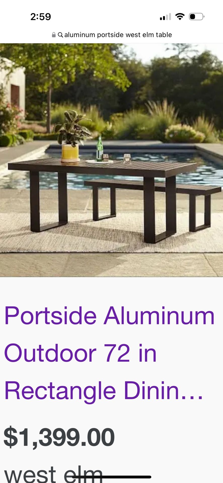 76” outdoor modern table. Only a couple years old. Price includes table and one bench. Pick up only. Table has some peeling on each side but a bit of black rustoleaum will fix that.
