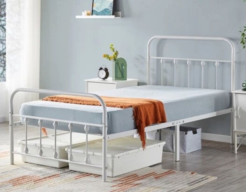 Classic Iron Platform Bed with High Headboard and Footboard, Strong Metal-Framed Bed with Storage If you are looking for a practical bed frame with a vintage look, this iron platform bed could be a good choice. Inspired by the traditional entrance gates, this bed is crafted of curved lines and round corners in a matte black finish, creating an elegant and warm tone. The bed is crafted with a metal slatted frame for solid support and long-term durability. Cleaning will be super easy, just wipe clean with damp cloth and a mild cleaner. The high headboard could kindly protect your head and provide you with a space to sit up comfortably. Ideal for guest rooms, bedrooms, dormitories, apartments and temporary stay. Product Details Simple Style Featuring a classic silhouette for style and elegance, this metal bed is designed with round corners to protect you from accidental hurt. Under-Bed Storage 12.5 inches of clearance space under the bed, spacious to meet your storage needs. Protective Foot Pads Anti-slip foot pads reduce scratches and slides. Powder-Coated Surface The metal surface with powder coating resists rusts and scratches, durable for long-term use. Sturdy Support Legs Sturdy support legs provide stability and level support, noise-free & no shake. Metal Frame Sturdy metal frame with outstanding weight-bearing capacity for great stability and durability. Specifications of Queen Size Bed Frame: Material: Iron Overall dimensions: 62.5 x 82.5 x 42'' (WxLxH) Max. weight capacity: 600lb Ground clearance: 12.5” N.W.: 47lb G.W.: 52.7lb Color: White