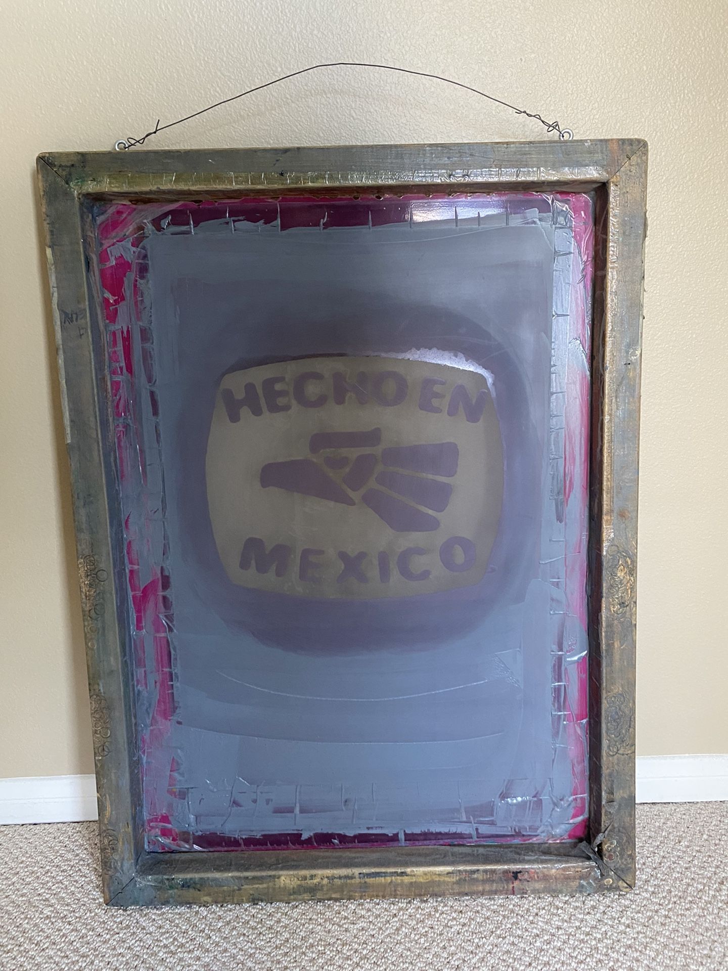 This unique art piece is made from an old screenprinting screen. It is 23” wide x 31.25” tall. The screen is a wood frame with wire to hang the art. Hecho En Mexico