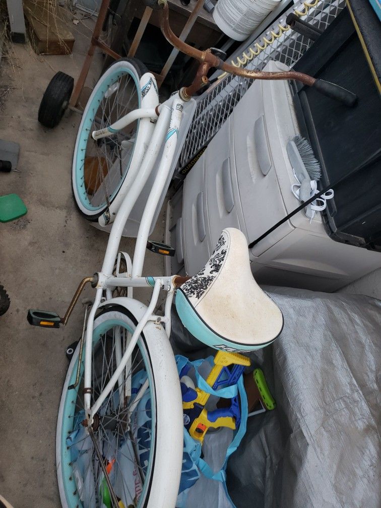 White beach cruiser. Paint is good.. Tires are good. A bit rusty