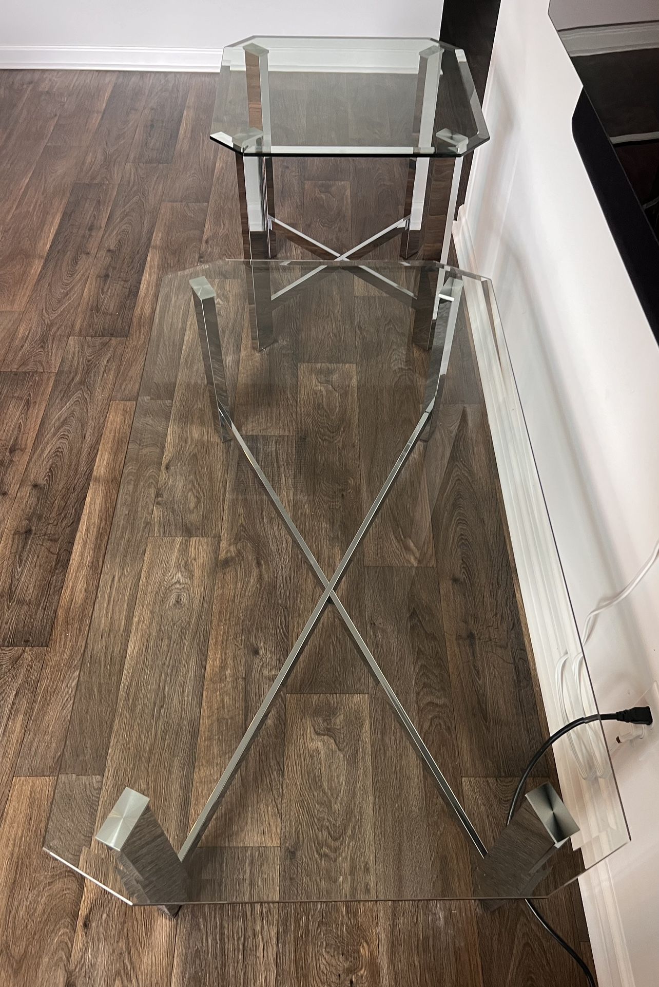 Thick beveled glass sofa table 50”x 28”, End Table 25”x 25”, Heavy chrome frames excellent condition new, Mint condition 300.00 Firm Both pieces, Cash & Carry Bring a Truck.