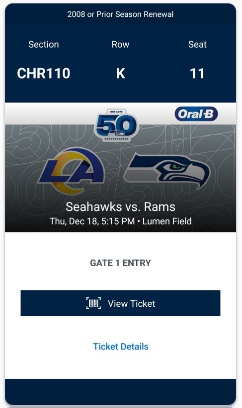 2 charter tickets to see JSN and the Seattle Seahawks take on Matthew Stafford and the Los Angeles Rams!!! These seats are 10 rows up on the 37 yard line right behind the visitor bench. Seattle Seahawks VS Los Angeles Rams Thursday, December 18th, 2025 @ 5:15pm Section: CHR110 Row: K Seats: 11 & 12 **Pictures are from the seats** $750 for the pair ($375 per ticket) NO LOW-BALLERS