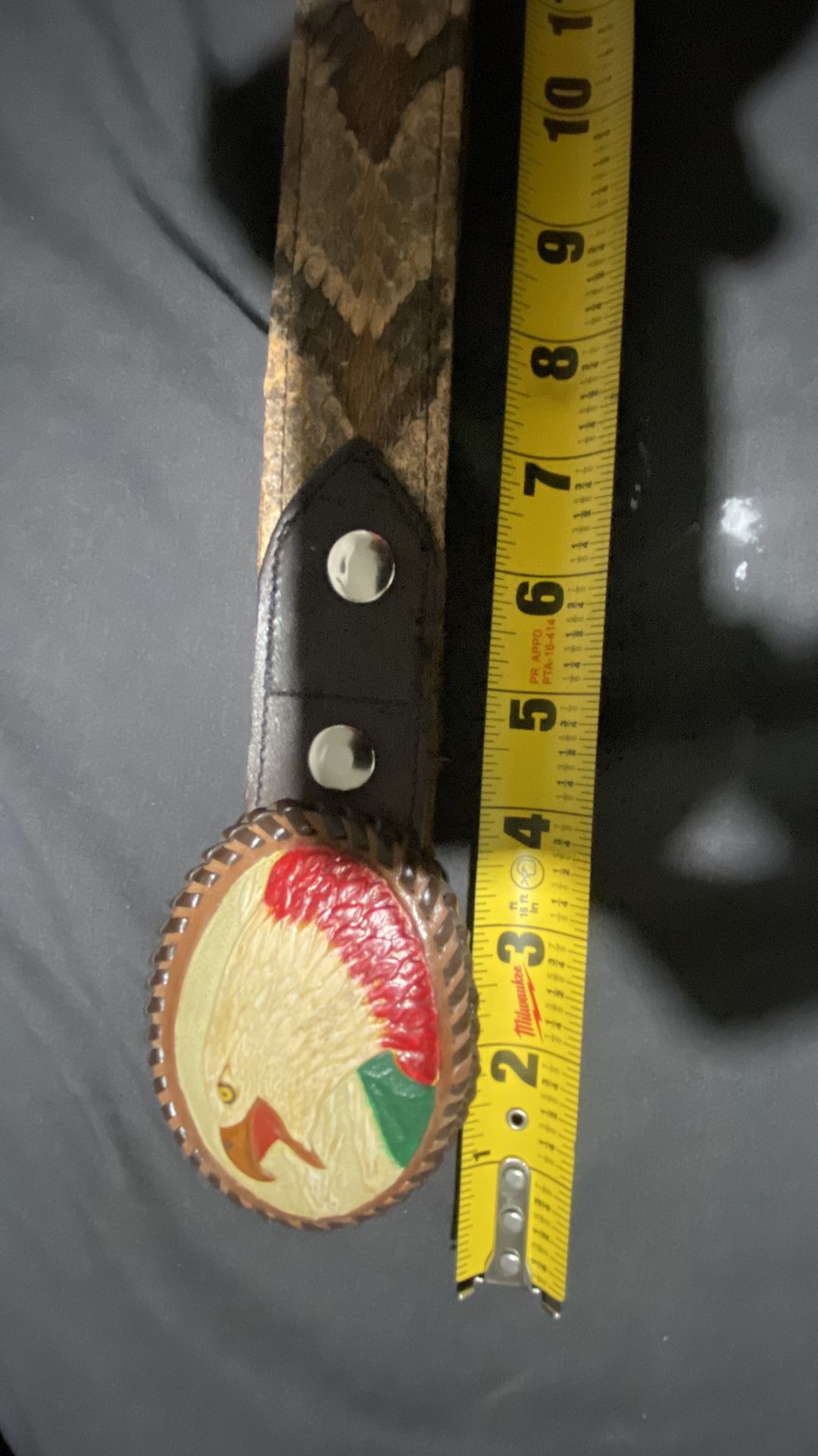 This is a denim belt with a distinctive design, which features a strap with a snakeskin pattern and an oval buckle that shows an eagle with the colors of the Mexican flag. Product Details Style: The belt is Western or cowboy style, popular in Mexico and the southwestern United States. Strap: The strap has a print or is genuine snake leather, probably cobra or python, which gives it an exotic and striking look. Buckle: The oval buckle features an eagle in relief, painted with the colors of the Mexican flag (green, white and red), evoking the Mexican national shield. This type of belt is a fashionable accessory that stands out and ensures that the wearer does not go unnoticed.