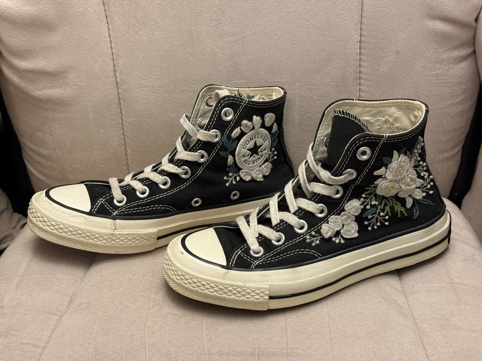 Black Converse All Stars (Chuck Taylors) with custom white and green floral embroidery. Worn just a few months before outgrown. Very light scuffing and minimal wear. Women's size 5/Men's size 3. Paid over $100 on Etsy.